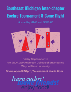 MI-E partners with SEMIAC to hold a friendly euchre tournament, inviting all other chapters in the area!Doors open at 5:30 for setup and teaching euchre, tournament starts at 6 pm.See attached flyer for parking details.